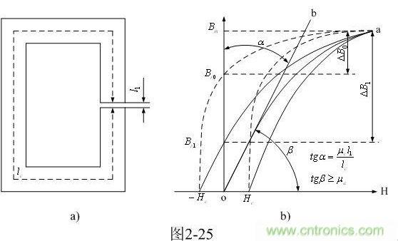 我們?cè)賮?lái)看圖2-25-b。在圖2-25-b中,虛線表示變壓器鐵芯沒(méi)有氣隙時(shí)的磁滯回線,實(shí)線表示變壓器鐵芯留有氣隙時(shí)的磁滯回線,其中磁化曲線o-a為留有氣隙鐵芯的基本磁化曲線。這里的基本磁化曲線與初始磁化曲線并不完全相同,這里的基本磁化曲線相當(dāng)于磁化曲線的幾何平均值,以便用于分析磁場(chǎng)強(qiáng)度增量與磁感應(yīng)密度增量,?B 的關(guān)系。