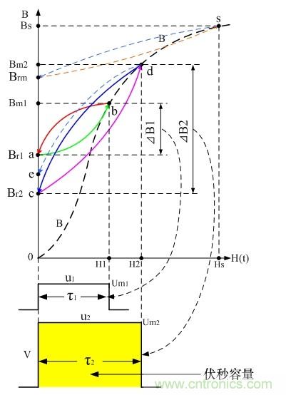 圖9是開(kāi)關(guān)變壓器伏秒容量與磁場(chǎng)強(qiáng)度H、磁感應(yīng)強(qiáng)度B的對(duì)應(yīng)關(guān)系圖。圖中,脈沖幅度V總是與磁感應(yīng)強(qiáng)度的增量