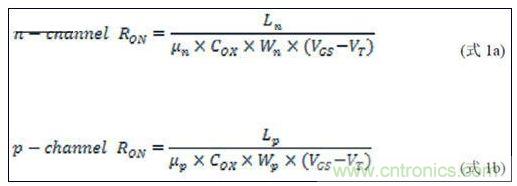 在VIN為各種電平條件下,p溝道和n溝道RON的并聯(lián)值形成并聯(lián)結(jié)構(gòu)的RON特征(圖2)。RON隨VIN的變化曲線在不考慮溫度、電源電壓和模擬輸入電壓對(duì)RON影響的情況下為直線。為使信號(hào)損耗和傳輸延遲最小,理想情況下的RON應(yīng)盡量小。然而,降低RON將增大MOSFET硅片的寬度/長度(W/L)比,從而造成較高的寄生電容和較大的硅片面積。這種較大的寄生電容降低模擬開關(guān)的帶寬。如果不考慮W和L,RON是電子和空穴遷移率(μn和μp)、氧化物電容(COX)、門限電壓(VT)及信號(hào)電壓、n溝道及p溝道MOSFET的信號(hào)電壓VGS (VIN)的復(fù)合函數(shù),如式1a和1b所示。