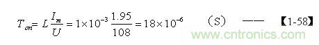 當占空比等于0.5時,對應的輸入電壓U為108V,對應的最大電流Im為1.95A,假設開關變壓器初級線圈的電感量L=1000uH,根據(jù)【1-45】式,可求得Ton的值為: