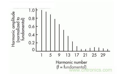 非線性負(fù)載可使諧波大小與線路頻率下的基本諧波電流具有可比性。圖4顯示了相對于線路頻率下的基本諧波大小進(jìn)行標(biāo)準(zhǔn)化的高階諧波電流大小。不過,只有圖1中給出的在與線路頻率相同的頻率下且與電源線電壓同相的諧波電流(在此案例中為線路頻率下的基本諧波)對提供給負(fù)載的平均功率起作用。這些諧波電流會影響同一電力線上的其他設(shè)備的工作情況。