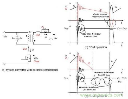 a.CCM模式時(shí),只有開關(guān)管關(guān)斷時(shí),由于漏感引起的震蕩(Lk和C);