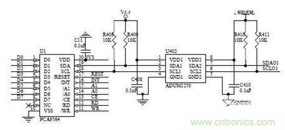 OZ89采樣模塊將采集處理后的數(shù)據(jù)通過I2C總線發(fā)送到LF2407,由于LF2407自身不帶I2C 接口,本設(shè)計利用PCA9564擴展其I2C接口。為了防止電磁干擾影響I2C總線上數(shù)據(jù)的傳輸,必須對總線信號進行隔離,考慮到I2C 總線是雙向傳輸?shù)?,使用ADuM1250雙向隔離芯片進行隔離。PCA9564及雙向隔離電路如圖2所示。