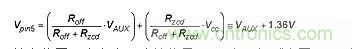 然后,施加在引腳5上的電壓就為偏置。事實(shí)上,這就像是VAUX電壓與減小了1.36V的ZCD閾值比較。這樣一來,新的實(shí)際ZCD閾值就是: