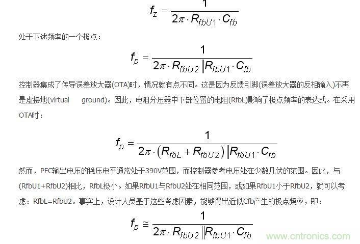 如果RfbU1與RfbU2處在相同范圍,低頻增益就略微增加,交越頻率就跟隨fp與fz的相同比率增加。如果與RfbU2相比RfbU1極小,我們就獲得在控制至輸出傳遞函數(shù)中抵消(cancel)的極點(diǎn)和零點(diǎn)。這樣,增加Cfb就對環(huán)路和交越頻率沒有影響。事實(shí)上,特別是在RfbL=RfbU2時(shí),這個(gè)增加的電容并不會大幅改變PFC段的動態(tài)性能。