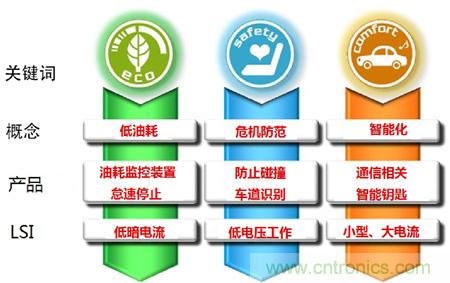 第一個關(guān)鍵詞是 "環(huán)保" (eco)。這在HV(混合動力汽車)、EV(電動汽車)向普通車輛的普及過程中作用顯著。另外,各汽車制造商之間的低油耗化競爭也日益激化。這些突破是由復(fù)雜且周密的電子化控制來實現(xiàn)的,當(dāng)然隨著HV、EV的普及和油耗性能的提升,所搭載的電子設(shè)備還會繼續(xù)增加。