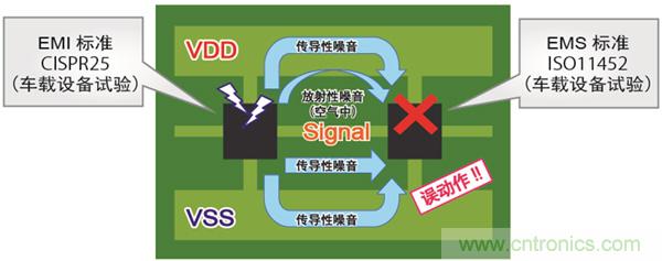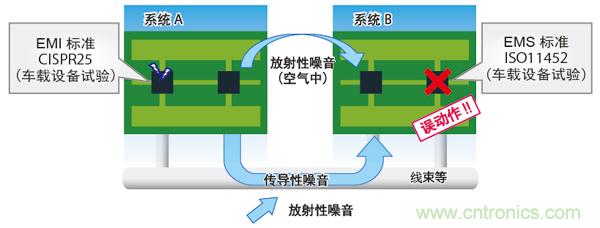 因此,對車載用產(chǎn)品來說,不妨礙其他設(shè)備(發(fā)射干擾)、以及受到其他設(shè)備妨礙時能保持本來的性能(抗干擾)是非常重要的。