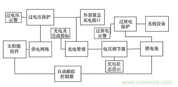 現(xiàn)有的光伏電池,單體的輸出電壓都很低(在1V 以下) ,本設(shè)計(jì)中,將多個(gè)光伏電池相串聯(lián),組成太陽(yáng)能組件。通過(guò)可以自動(dòng)調(diào)節(jié)占空比的供電網(wǎng)絡(luò)保證在光照強(qiáng)度變化和負(fù)載變化時(shí),輸出電壓基本穩(wěn)定,為充電管理芯片提供穩(wěn)定的電壓輸入。通過(guò)對(duì)供電網(wǎng)絡(luò)的副邊電壓監(jiān)測(cè),保護(hù)充電管理芯片不因電壓過(guò)高而損壞。通過(guò)對(duì)電池兩端的電壓監(jiān)測(cè),保證鋰電池不會(huì)因過(guò)放電而損壞。由于無(wú)線示功儀及其中繼網(wǎng)絡(luò)節(jié)點(diǎn)的供電要求是313V,采用低噪聲、高速度的CMOS型電壓調(diào)節(jié)器。在自動(dòng)跟蹤控制器作用下,始終保持全天候跟蹤太陽(yáng)。為了防止因連續(xù)陰雨天而導(dǎo)致的太陽(yáng)能供電不足,設(shè)計(jì)應(yīng)急充電電路,充電期間,無(wú)線示功儀及其節(jié)點(diǎn)正常運(yùn)行。具體系統(tǒng)設(shè)計(jì)模塊如圖1 所示。