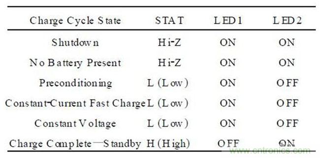 表1:MCP73831 電路設(shè)計(jì)中指示燈的邏輯關(guān)系