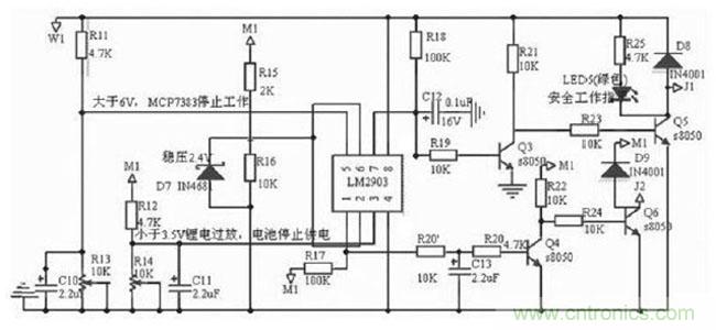 當(dāng)鋰電池電壓低于315V 時(shí),即電池電量釋放92%以上時(shí),認(rèn)為不能繼續(xù)放電,否則鋰電池內(nèi)部介質(zhì)會(huì)發(fā)生變化,致使充電特性變壞,容量降低等。為此設(shè)計(jì)過(guò)放電保護(hù)控制電路,此電路的具體設(shè)計(jì)如圖3,分析如下:采用了LM 2903的1,2,3 腳組成的一路比較器,與外圍器件構(gòu)成過(guò)放電壓比較器,R12 , R14分壓后接至LM 2093 的3 腳。當(dāng)電壓值小于315V 時(shí),分壓值小于214V,LM 2903的1 腳由高電平轉(zhuǎn)變?yōu)榈碗娖剑?Q4 由導(dǎo)通轉(zhuǎn)變?yōu)榻刂範(fàn)顟B(tài), Q6 飽和導(dǎo)通,JDQ2 工作,同時(shí)過(guò)放紅色指示燈亮。