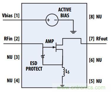 圖:MMIC本身由一個(gè)單個(gè)的FET共源放大器和一個(gè)動態(tài)偏壓調(diào)制器組成