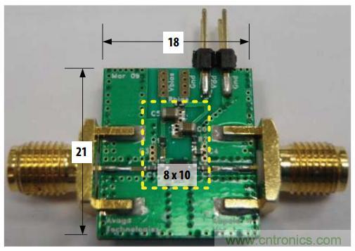 圖中PCB的尺寸為21.5×18×1.4mm,PCB板材有兩層,頂層為Rogers的RO4350,厚度為10mil,底層為低成本的FR4,厚度為 1.2mm,二者的接地銅箔緊緊的結(jié)合在一起。射頻連接器是Johnson的SMA接頭,DC電源接頭是2-pin的連接器,被動元件的尺寸都是0402 的,這樣整個(gè)元器件區(qū)域的大小約為8×10mm2。