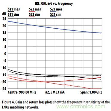 在900MHz,低噪放的噪聲大約為0.3dB,增益大約為18dB,輸入和輸出回波損耗為小于-15dB。另外,在1GHz的帶寬內(nèi),回波損耗都可以滿足 這個(gè)要求。從系統(tǒng)的角度來說,這個(gè)是非常受歡迎的特性。主要是由于傳統(tǒng)的基站需要靠隔離器或者3dB耦合器來滿足系統(tǒng)回波損耗的要求。進(jìn)一步來說,輸入輸 出匹配的寬帶寬也使得基站的雙工器或者輸入輸出濾波器的使用調(diào)試變得簡單,降低了系統(tǒng)的設(shè)計(jì)復(fù)雜度。