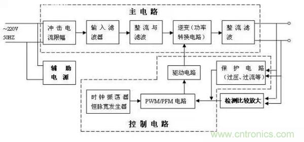 開關(guān)電源大至由主電路、控制電路、檢測電路、輔助電源四大部份組成,見圖1。