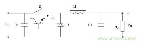 開關(guān)電源就是采用功率半導(dǎo)體器件作為開關(guān)元件,通過周期性通斷開關(guān),控制開關(guān)元件的占空比來調(diào)整輸出電壓。開關(guān)元件以一定的時間間隔重復(fù)地接通和斷開,在開關(guān)無件接通時輸入電源Vi通過開關(guān)S和濾波電路向負載RL提供能量,當開關(guān)S斷開時,電路中的儲能裝置(L1、C2、二極管D組成的電路)向負載RL釋放在開關(guān)接通時所儲存的能量,使負載得到連續(xù)而穩(wěn)定的能量。