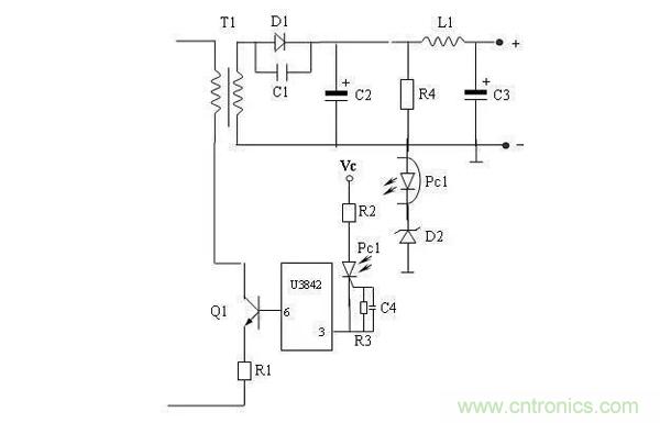 經(jīng)檢查此開關(guān)電源采用U3842 PWM控制芯片,經(jīng)查找相關(guān)的資料得知,當U3842芯片的3端電壓高于1伏時,內(nèi)部電流敏感比較器輸出高電平,將PWM鎖存器復(fù)位使輸出關(guān)閉。通電測量U3842的3端高于1伏,6端無輸出,經(jīng)檢查相關(guān)電路,發(fā)現(xiàn)穩(wěn)壓管D2擊穿,如圖3,故PC1導(dǎo)通,致使U3842的3端為高電平,故6端無輸出,開關(guān)管不工作,直流側(cè)無直流輸出。更換同型號穩(wěn)壓管D2,故障解除。