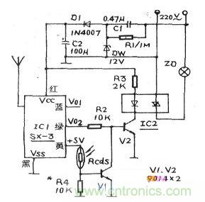 IC1是一只SX-3型人體接近開關(guān)集成電路模塊,該器件最大探測距離可達(dá)10米。其中紅線接正電源端,黑線接公共端,黃線為+5v電源輸出端,供外部使用,藍(lán)線為即時(shí)開關(guān)信號(hào)輸出端(本電路不用),綠線為具有時(shí)間累積功能的延時(shí)開關(guān)信號(hào)輸出端。220V市電由C1降壓、D1整流、C2濾波、DW穩(wěn)壓后為控制電路提供12V直流電源。平時(shí),沒有人接近IC1或當(dāng)行人很快從報(bào)欄前經(jīng)過時(shí),IC1的VO2端輸出低電平,后級(jí)電路不動(dòng)作,燈不亮。當(dāng)有人要看報(bào)在報(bào)欄前停頓數(shù)秒后,IC1的V02端輸出高電平。白天時(shí),光敏電阻Rcds為低阻值,V1導(dǎo)通,V2截止,后級(jí)電路仍不能工作。晚聞Rcds為高阻值,V1截止,的高電平使V2導(dǎo)通,光電耦合器IC2內(nèi)藏發(fā)光二極管發(fā)光,光敏可控硅開通,燈泡ZD發(fā)光。閱報(bào)者離開后,IC1V02端又變?yōu)榈碗娖?,ZD自動(dòng)熄滅。