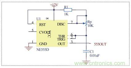 2.1.1 NE555D脈沖發(fā)生器模塊 如圖1,根據(jù) T =(R1+Rp)C1,f = 1/T,調節(jié)Rp使NE555D輸出一個36.7KHZ的脈沖頻率。