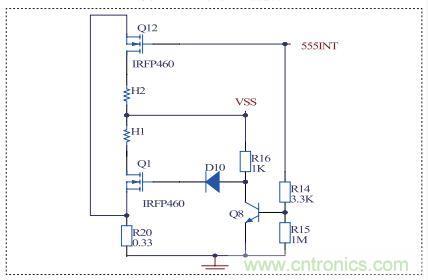 主要把NE555D產(chǎn)生的一個36.7KHZ的脈沖功率放大,經(jīng)發(fā)射線圈發(fā)射出去。當脈沖為高電平時,Q12柵極為高電平,Q12導通,此時Q8飽和,Uceq電壓只有0.67V,經(jīng)D10-4148后Q1柵極電壓為0,Q1截止。當脈沖為低電平時,Q8、Q12同時截止,電流直接由R16 D10 Q1,Q1導通。整個過程中Q1與Q12均以一開一關的形式工作。電路如圖2: