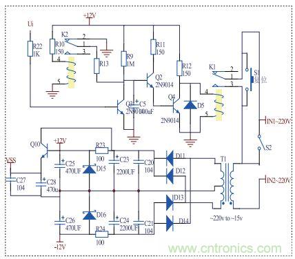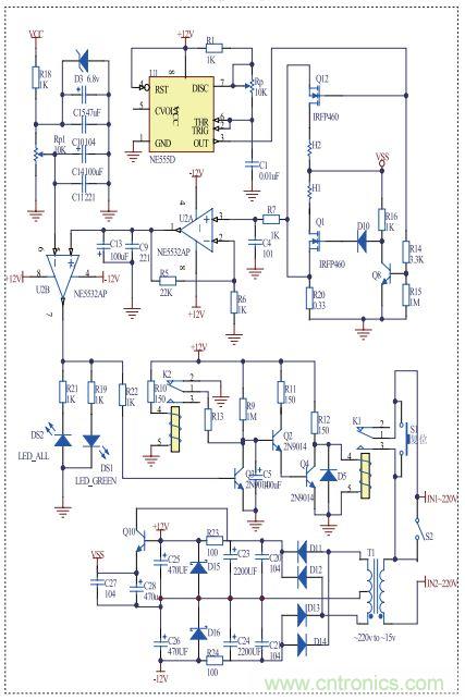 斷電后,繼電器K2閉合,此時C5與R13構成RC放電電路,給C5快速放電。當按一下輕觸復位開關時,充電器重新啟動。當感應負載充滿電(或無感應負載)時,電容C5充電,其電壓為Ut 由公式Ut=12*(1-e-t/R9C5)得:t=-R9C5ln(1-Ut/12) 其中C5=100UF,R9=1MΩ,Ut=1.34V, 經(jīng)計算得斷電時間:t=10S 實現(xiàn)了10秒自動斷電。在綠燈亮的10秒內只要有感應負載,則Ui為高電平,Q3飽和,電容C5放電。整個充電過程實現(xiàn)智能化斷電。