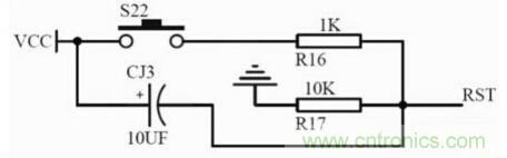 (2)按鍵復(fù)位:按鍵復(fù)位就是在復(fù)位電容上并聯(lián)一個(gè)開關(guān),當(dāng)開關(guān)按下時(shí)電容被放電、RST也被拉到高電平,而且由于電容的充電,會(huì)保持一段時(shí)間的高電平來(lái)使單片機(jī)復(fù)位。
