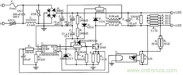 LED節(jié)能燈的快速發(fā)展,使得LED驅動電路的設計更加嚴格,整個電路不僅要安全低功耗,還應該具有恒流特性,即電源電壓變動幅度<15%時,輸出電流的變化幅度不超過10%,這樣才能保證LED驅動電路較高的能量利用效率。
