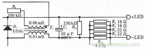 如圖2所示,此電路通過變壓器輸出適當?shù)碾娏?,當有LED負載時,電路中通入適當?shù)碾娏骱皖l率使LED正常工作;當沒有負載時,變壓器中仍然殘留有能量,需要釋放。此時由R17等構成的回路,可以慢慢地釋放變壓器中的電能。但當電流突然減小時,變壓器中會產(chǎn)生感應電動勢,由此會產(chǎn)生較高的反向電壓,可能會擊穿器件。為了克服這個問題,在線圈的兩端并聯(lián)一個續(xù)流二極管D1,同時在電路輸出端串聯(lián)R15,并且在R15兩端并聯(lián)R2,R3,R4,R6。R15有降壓作用,并且能為反饋電路提供電壓。由于R15承受的功率較大,容易燒壞,所以預備一個由R2,R3,R4和R6的并聯(lián)等效電阻,這樣每個電阻承受的功率變小,在增加使用壽命的同時,能夠減少維修費用。