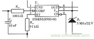 如圖4所示,電路通過T1、D7獲取穩(wěn)定的22 V電壓,供給芯片工作,芯片通過2號引腳進行取樣輸入,C4對電路的頻率和電壓進行控制。