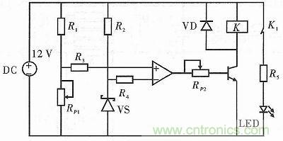 合理的蓄電池充放電,不僅可以延長蓄電池壽命,且能提升整個電路系統(tǒng)的穩(wěn)定性。因此需要設計保護電路,以保證蓄電池能在一定的電壓范圍內(nèi)進行充放電。本項目使用3級級聯(lián)的12 V鉛酸蓄電池。由于過充電路與過放電路有相似性,本文只給出蓄電池的過放電路,如圖5所示。電源電壓正常時,調(diào)節(jié)電位器RP1使放大器的同相輸入端的電位略高于反相輸入端的電位,此時放大器輸出低電平,VT截止,電路正常工作。當電源電壓<10.5 V時,反相輸入端的電位大于同相輸入端的電位,放大器會輸出高電平,調(diào)節(jié)RP2,使VT導通,此時負載與電源斷開。