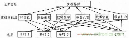 我們采用自頂向下的設計方式,將系統(tǒng)分為3層:主界面層、邏輯功能層和底層。“主界面層”主要包括主人機界面和系統(tǒng)總體控制。“邏輯功能層”負責系統(tǒng)的各種邏輯功能,例如I/O設置、數(shù)據(jù)采集、數(shù)據(jù)處理、數(shù)據(jù)管理和數(shù)據(jù)查詢等。“底層”則是一個個按照基本功能劃分子VI,供給高層次VI調(diào)用。采用調(diào)用子VI的形式來實現(xiàn)模塊之間的調(diào)用和關聯(lián)。當調(diào)用子VI時,系統(tǒng)需要花費很少的開銷,大概幾十毫秒的時間。測試系統(tǒng)的軟件層次結構圖3所示。
