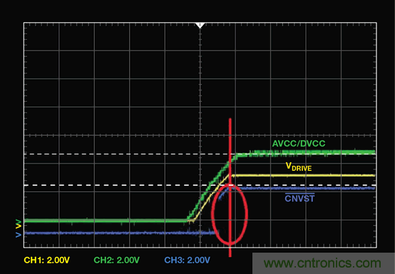 在所有電源均完全建立之前,不得切換數(shù)字引腳。對于SAR ADC,轉換開始引腳CNVST 可能對噪聲敏感。在圖1 所示示例中,當AVCC、DVCC 和VDRIVE 仍在上升時,主機cPLD 拉高CNVST。這可能使 AD7367 進入未知狀態(tài),因此,在電源完全建立之前,主機應使 CNVST 保持低電平。