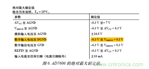 過沖和欠沖可能損壞輸入保護電路,或者縮短IC 的使用壽命。圖6 所示為 AD7606 的絕對最大額定值。數(shù)字輸入電壓應在–0.3 V 和VDRIVE + 0.3 V 之間。另外,如果振鈴高于最大VIL 或小于最小VIH 可能導致邏輯誤差。