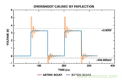在圖8 中,SCLK1 上的大過沖違反了–0.3 V 至+3.6 V 的絕對最大額定值。串聯(lián)電阻可減小SCLK2 上的壓擺率,使信號處于額定值之內。