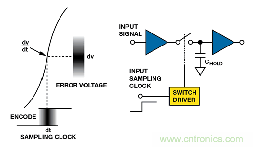 孔徑或采樣時鐘抖動設定SNR 限值,尤其是對高頻輸入信號。系統(tǒng)抖動有兩個來源:來自片內采樣保持電路的孔徑抖動(內部抖動),以及采樣時鐘上的抖動(外部抖動)。孔徑抖動為轉換間的 采樣時間變化,為ADC 的函數(shù)。采樣時鐘抖動通常為主要誤差源,但兩個源都會導致模擬輸入采樣時間變化,如圖9所示。它們的影響難以區(qū)分。