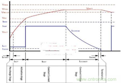 充電開始為預(yù)充階段,以檢查電池狀況是否良好。在此階段中,通常給電池提供電池容量5%到15%的少量電流,如果電池電壓上升到2.8V以上,則認(rèn)為電池狀況良好,可以進(jìn)入到激活階段。在此階段中,給電池提供相同的電流,但會(huì)持續(xù)更長的時(shí)間。當(dāng)電池電壓上升到3V以上,則啟動(dòng)快充,并提供等于或低于電池容量的恒定電流。