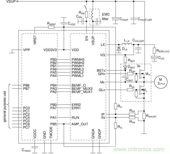 完善的內(nèi)部集成功能使得PCB板級的設(shè)計變得簡單,另外,其內(nèi)置的BEMF測量模塊,使得用戶在測量相電壓時無需使用外部分壓電阻,進(jìn)一步簡化板級的設(shè)計。