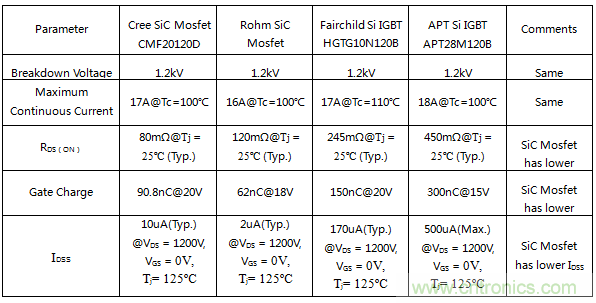 目前市面上常見(jiàn)的SiC Mosfet電流均不大于50A,以常見(jiàn)的1200V/20A為例,列舉了Cree公司與Rohm公司的SiC Mosfet管的部分電氣參數(shù);同樣例舉了Fairchild 與APT公司的1200V/20A Si IGBT系列的電氣參數(shù)進(jìn)行比較;