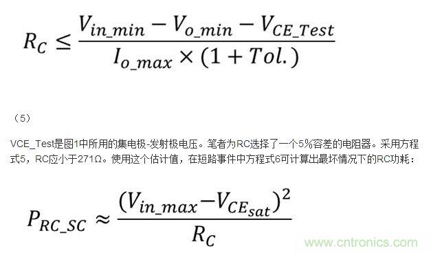 電阻器RC將會(huì)滿足輸出調(diào)節(jié)要求,并能在短路事件中耗散功率。筆者可計(jì)算出RC的值: