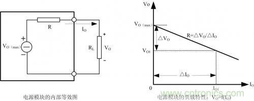 圖 1為電源模塊的內(nèi)部等效與輸出負(fù)載特性曲線:VO=f(IO),R為模塊的輸出阻抗(包含導(dǎo)線電阻和接觸電阻等),空載時,模塊輸出電壓為最大值VO(max)。當(dāng)負(fù)載電流變化△IO時,負(fù)載電壓變化量為△VO,△VO=R*△IO,R*△IO也表示模塊的負(fù)載調(diào)整率。負(fù)載電壓VO與負(fù)載電流IO的關(guān)系可表示為: