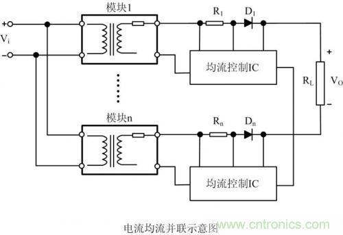 如果兩個模塊的參數(shù)完全相同時,即:VO1(max)= VO2(max)、R1=R2,則兩條負(fù)載特性曲線重合,能實現(xiàn)負(fù)載電流均勻分配。但在實際應(yīng)用中,兩個具有相同容量的模塊,VO1(max)與VO2(max)、R1與R2的參數(shù)也不可能完全做到相同。從圖 2可以看出,由于輸出到負(fù)載RL的等效阻抗R1、R2很小,輸出電壓即便出現(xiàn)很小的差別也會引起輸出電流很大的變化。例如:當(dāng)負(fù)載RL電流由IO= IO1+ IO2增大到IO、=IO1、+IO2、時,負(fù)載特性曲線斜率小的模塊1將承受大部分負(fù)載電流,模塊1將運行在滿載或過載限流狀態(tài),影響模塊的可靠性。