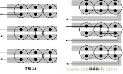 輸出濾波電容放置及走線對(duì)紋波噪聲至關(guān)重要,如圖1所示,傳統(tǒng)設(shè)計(jì)中由于到達(dá)每個(gè)電容的阻抗不一樣,所以高頻電流在三個(gè)電容中分配不均勻,改進(jìn)設(shè)計(jì)中可以看出每個(gè)回路長(zhǎng)度相當(dāng)即高頻電流會(huì)均勻分配到每個(gè)電容中。