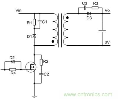 可以在場(chǎng)效應(yīng)管DS兩端并聯(lián)一個(gè)RC電路也可以有效的降低噪聲干擾如圖2所示,電容C2一般在100P左右,電容值過(guò)大會(huì)導(dǎo)致場(chǎng)效應(yīng)管的開(kāi)關(guān)損耗加大,電阻R2一般選取小于10Ω電阻。