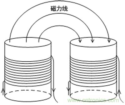 LC對(duì)噪聲和紋波抑制效果比較明顯,根據(jù)紋波頻率選擇合適電感電容值,但由于柱形電感價(jià)格低體積小的優(yōu)點(diǎn),所以一般LC中電感大都會(huì)選擇柱形電感,然而柱形電感是開(kāi)放式磁結(jié)構(gòu),對(duì)周圍會(huì)產(chǎn)生較嚴(yán)重磁干擾,我們可以采用兩個(gè)電感并排放置,且電流流入方向相反,即有助于引導(dǎo)磁通從一個(gè)磁柱到另一個(gè)磁柱,從而可以降低電磁干擾,如圖3所示。