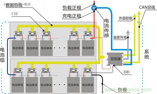 為了解決連線復雜的難題,出現(xiàn)了分布式架構(gòu)的BMS。這種BMS是將信息采集傳遞的功能與其他功能獨立分離,整個系統(tǒng)分成了CSC(單體管理單元)、BMU(電池管理控制器),CSC安裝在單串電池上,負責本串電池信息采集和傳遞,每串電池的信息通過總線傳入BMU。這種架構(gòu)通過總線解決了線束復雜的難題,而且安裝相對簡單,效率高,柔性好,適合不同電池組規(guī)模大小。