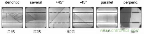 2011年,德國ISFH公布了他們的研究結(jié)果:根據(jù)電池片隱裂的形狀,可分為5類:樹狀裂紋、綜合型裂紋、斜裂紋、平行于主柵線、垂直于柵線和貫穿整個電池片的裂紋。