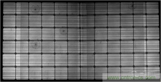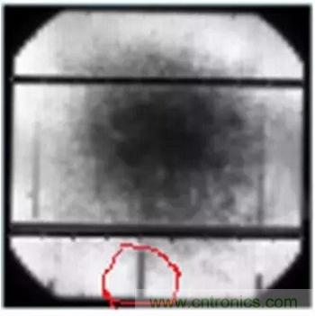 給晶硅組件施加電壓后,所激發(fā)出的電子和空穴復(fù)合的數(shù)量越多,其發(fā)射出的光子也就越多,所測得的EL圖像也就越亮;如果有的區(qū)域EL圖像比較暗,說明該處產(chǎn)生的電子和空穴數(shù)量較少(例如圖3中電池中部),代表該處存在缺陷(復(fù)合中心);如果有的區(qū)域完全是暗的,代表該處沒有發(fā)生電子和空穴的復(fù)合(圖3和圖4中紅線所標處),也或者是所發(fā)光被其它障礙所遮擋(圖3和圖4主柵線處),無法檢測到信號。