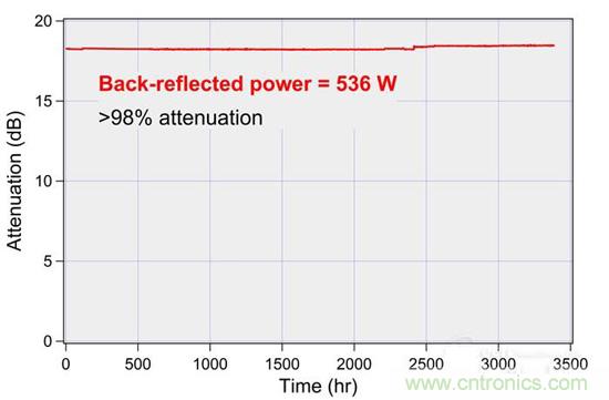 因為工件表面的不規(guī)則、與表面法線對齊不精確以及處理光學元件采光角度的限制,典型的回返激光通常只占一小部分激光器的功率,此外,回返現(xiàn)象通常持續(xù)時間很短,例如打孔這樣的應用。但是,部分光纖激光器的設計會導致難以處理甚至無法處理反射材料?;胤翟斐傻膿p傷通常是由于光功率在聚合物材料上能量堆積而導致過熱或燃燒引起的。nLIGHT altaTM光纖激光器會剝除耦合到饋送光纖的回返光,并將其引導到水冷光束吸收器,激光在此被轉(zhuǎn)換為熱量,不涉及任何聚合物,從而消除了主要的損壞原因。無聚合物的隔離器旨在連續(xù)吸收消除>500 W的回返激光,如壽命測試所示。