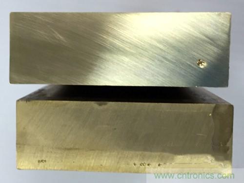 下圖所示為恩耐nLIGHT altaTM光纖激光器與某傳統(tǒng)光纖激光器進行黃銅焊接后的截面 - 前者卓越的焊接質(zhì)量顯而易見。