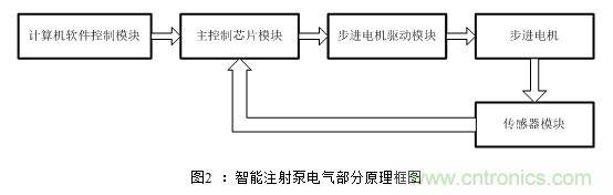 傳感器模塊實(shí)時(shí)的檢測(cè)實(shí)際情況并反饋給控制部件。簡(jiǎn)單講,注射泵的電氣部分的工作原理如下圖2: