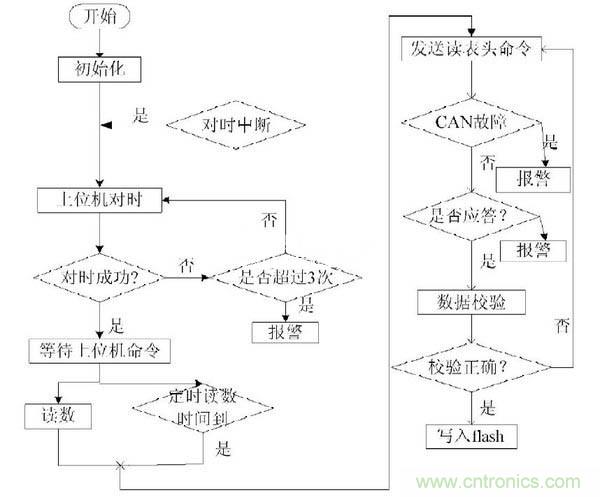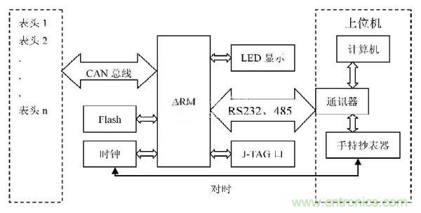 集中器通過CAN控制器發(fā)送讀表命令信號到總線上,每個表頭根據(jù)讀表命令將采集的信號通過CAN總線發(fā)送到集中器。集中器將采集的信號存儲在flash芯片中。上位機通過串口發(fā)送讀數(shù)據(jù)信號到集中器,集中器就把存儲在flash中的數(shù)據(jù)傳送給上位機。